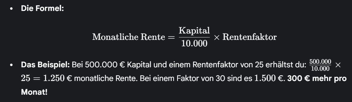Der Rentenfaktor ist der Betrag, den du pro 10.000 Euro angespartem Kapital als monatliche Rente erhältst.